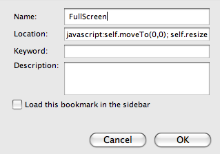 2. Give the bookmark a name like Fullscreen (something that you can remember) and then paste the code below in the Location box. Make sure you paste all the code in 1 line only though, or else it won't work.